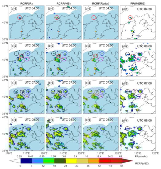 Figure 6 presents a set of developing convective events monitored by the retrieved RCRF maps over a time series. This rapidly developing convective system was generated at 04:30 UTC on July 8, 2020, and was maintained for two and a half hours. Then, this convective system entered the mature and stable stage. The retrieved RCRF (especially by the visible model) and precipitation maps at 04:30 UTC show that the convective target-1 (marked by the red circles) has developed to a mature stage, but it only corresponds to 2–3 pixels on radar maps at that moment. Note that similar phenomena are observed for convective target-2, target-3, and target-4. Therefore, it can be concluded that the retrieved RCRF maps in Figure 6 agree with the structures of the precipitation fields very well during the lifespan of this convective system. Particularly, the RCRF maps retrieved by the visible model are more sensitive to the initial convection with long leading time.