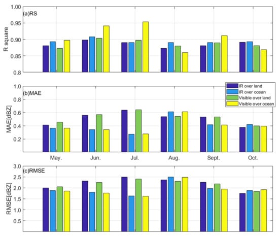 Figure 8 presents the statistical indicators for the retrieved RCRF maps over two different regions (land and ocean) from May to October in 2020. It can be seen that the RCRF maps retrieved by the visible model exhibit a better performance over the ocean area, with an MAE of 0.3–0.62 dBZ and an RMSE of 1.6–2.3 dBZ. In contrast, the results from the infrared model over the ocean have an MAE of 0.38–0.7 dBZ and a higher RMSE of 1.8–2.5 dBZ. However, the results from the infrared model over the land performs the worst, with an MAE of 0.4–0.8 dBZ and an RMSE of 1.7–2.8 dBZ. Among them, the worst case occurred in July with an MAE of 0.8 dBZ and an RMSE of 2.8 dBZ. Overall, the accuracy of the retrieved data is higher over the ocean than that over the land in May–July and September. However, the situation in August is the opposite. In addition, the accuracies of the retrieved data over the ocean and land are almost equal in October. One of the reasons is that summer is the peak season for the occurrence and development of severe convections in China. Due to the rapid development of convective systems, the uncertainty of the spatio-temporal matching increases, leading to the relative errors of summer samples. The mechanisms, duration, and spatio-temporal scales of summer precipitation are extremely complicated. In addition, the topography is more complex over the land, where convective systems in summer are mainly triggered by the unstable environment due to the obvious heating, while the situation is the opposite over the ocean. The complex topography of the land surface together with the more homogeneous ocean surface contribute to the existing differences between land and ocean.