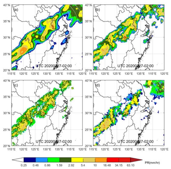 Precipitation Rain rate (mm/h) maps at 02:00 UTC on July 27 of 2020, including (a) PR retrieved from RCRF maps using infrared channels, (b) PR retrieved from RCRF maps using visible/near-infrared channels, (c) PR from radar RCRF maps, and (d) PR from GPM IMGER data.