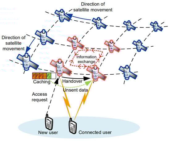 LEO satellites are typically deployed at low altitude, such as 500 km to 1500 km, and the LEO satellites move with a high speed relative to the users on the ground. Thus, frequent handover may occur during the service time of users. This paper considers a constellation of LEO satellites in the sun-synchronous orbit. There are 12 orbits within the constellation, and 9 satellites are located at each orbit. The satellites are located at an altitude of 1000 km and have an orbital inclination of 99.4843 deg. A typical handover scenario in the LEO satellite system is presented in Figure 1. Each terrestrial user terminal establishes a communication link with an LEO satellite for transmitting data. Due to the high mobility of the LEO satellite, the terrestrial users will move out of the coverage of the serving satellite after a period of connecting, and handover is required to ensure continuous communication. In addition to this case, the access of new coming users can also lead to handover within the system. And the adjacent satellites will continuously exchange the remaining resource information through the inter-satellite link. When the source satellite detects that the handover is needed for the connected user links, it will analyze the resource information and select the best satellite from the candidate satellite list. Before the handover, the data that has not been sent will be cached, and then the cached data should be sent to the optimal candidate satellite after the new link is established.