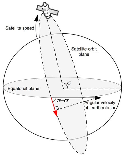 where and are, respectively, the angular velocity of the satellite and the Earth in the Earth-Centered Inertial(ECI) coordinate system, is the satellite orbit inclination, can be expressed as
