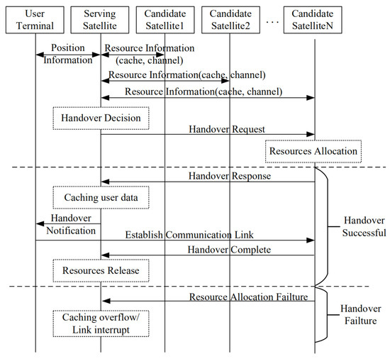 This paper proposes an inter-satellite handover strategy, where the handover decisions are made by the serving satellite, and handover flow is shown in Figure 6. Firstly, the user periodically reports the user’s location to the serving satellite, and the satellite calculates the remaining service time according to the user’s location. At the same time, each satellite will periodically send its resource information to adjacent satellites, mainly including the number of idle channels and the remaining caching capacity. For example, at a certain time slot, the serving satellite will receive resource information from adjacent satellites and make handover decisions according to the user location information and the satellites resource information. In detail, the trained DRL network is adopted to decide when will the handover be executed and the candidate satellite. If the handover procedure is activated, the serving satellite will send the handover request to the optimal candidate satellite. Then, the optimal candidate satellite applies for the resources. If the resources are sufficient, it will send the handover response to the serving satellite, who is caching the unsent user’s data and sends the handover notification to the user. From then on, the user and the candidate satellite can establish the communication link, and the handover can be completed. If the candidate satellite has no remaining resources, or the serving satellite’s caching is overflow or the link is interrupted, handover failure occurs.