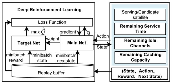 The specific design of an intelligent handover decision network based on DRL, which is shown in Figure 7, can be denoted as a tuple (S, A, P, R). S denotes the state space of the LEO system. A is the handover action space. P is the space of the state transition probability. S denotes the reward of state and action.