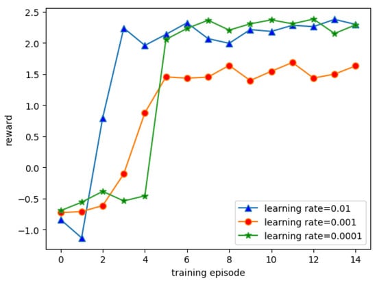 In the simulation, the convergence characteristics of the reward value with different learning rates, which are 0.0001, 0.001, and 0.01, are compared and shown in Figure 9. Simulation results show that different learning rates will achieve different performances, and the convergence speed will also vary. It can be seen from Figure 9 that the convergence speed with learning rate 0.01 is the fastest, and the reward value after convergence has a small fluctuation range and high stability. The reward value with a learning rate of 0.01 is much higher than that, with a learning rate of 0.001. Therefore, the learning rate in this paper is set as 0.01.