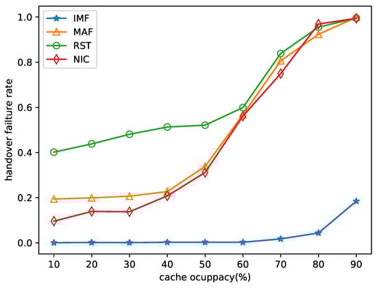 Figure 10 compares the performance of four handover strategies in terms of handover failure rate. RST represents the traditional handover strategy based on the remaining service time (RST), which takes the maximum remaining service time as the selection criteria for selecting optimal candidate satellites, and handover is activated when the current serving satellite has no remaining service time. NIC is a traditional handover strategy based on the number of remaining idle channels (NIC), which takes the maximum number of remaining idle channels as the selection criteria for selecting candidate satellites, and handover is activated when there is no remaining service time. MAF is a multi-attribute fusion (MAF) decision based on the TOPSIS evaluation strategy. The strategy considers the remaining service time and the number of idle channels to select the optimal candidate satellite, and handover is activated when there is no remaining service time. IMF is the handover strategy of Intelligent multi-attributes fusion (IMF) decisions based on the DRL, which is proposed in this paper. It can be seen from Figure 10 that the handover failure rate increase with the raise of caching occupancy. Among the strategies, the RST strategy has the highest handover failure rate because it does not consider the remaining channel resources and the remaining caching capacity. Moreover, the growth trends of the handover failure rate of RST, NIC, and MAF are significantly improved when the caching occupancy is higher than 50%. When the caching occupancy is 90%, the handover failure rate is close to 100%. When the caching occupancy is 90%, the handover failure rate of IMF is close to 20%, which shows its performance gain over the referred strategies. Therefore, the proposed IMF handover strategy has the best performance with high caching occupancy.
