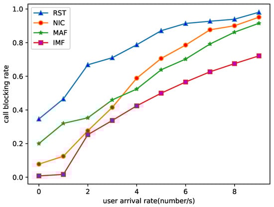 Here, new coming users arrive in the satellite coverage area and send an access request to the satellite. However, because the satellite does not have enough remaining channel resources for serving all the new coming users, new coming users’ access requests are rejected. In this paper, we consider the average call blocking rate in one hour under a high load rate (95% channel occupancy). The call blocking rate can reflect the flexibility of the handover algorithm and the QoS of users in the coverage area. As shown in Figure 11, the call blocking rate of every handover strategy is increasing with the rise of user arrival rate. Among them, the new call blocking rate of RST is the highest because the channel state is not considered. The call blocking rate of the NIC is lower than that of the RST strategy. The MAF strategy considers the remaining service time and the number of idle channels, but the blocking rate is still high because it cannot flexibly adjust the connections of connected users. The IMF strategy can not only consider multiple factors but also flexibly configure the connected user link. If necessary, the connected user link can be reset to the other satellites with the idle channel resources, and it can greatly reduce the call blocking rate. The simulation results show that the call blocking rate of IMF is the lowest. Especially when the user arrival rate is 10, the call blocking rate of IMF is about 23% lower than that of the RST strategy.