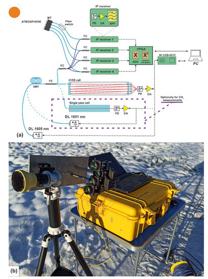 An introduction to the laser heterodyne spectroscopy in the NIR spectral range and details of different multichannel infrared heterodyne receiver implementation techniques could be found in [35,36,42,43,44,45]. This section presents the ground-based prototype of the MLHS employed for field measurements and discusses its analytical characteristics and capabilities. Figure 1 demonstrates a sketch and real form of the MLHS prototype capable of measuring atmospheric absorption of carbon dioxide and methane in the vicinity of 1605 and 1651 nm, respectively, by direct Sun observation. The spectroradiometer has four identical heterodyne channels, each consisting of entrance optics, photodetectors, and intermediate frequency (IF) receivers. The role of these channels is to detect laser radiation superimposed by a fiber coupler (FC) with solar radiation passed through the atmosphere. The IF receiver circuit, which extracts the IF beat signal, has a transimpedance amplifier with a feedback resistance of 5 kOhm, and a sequence of cascades with the gain factor of G ~750 and bandwidth of B ~20 MHz. The signal from each IF receiver is digitized by an 8-bit analog-to-digital converter (ADC) at the sampling frequency of 75 MHz and then processed by a field-programmable gate array (FPGA)-based IF signal analyzer. Next step of IF signal processing is variance calculation provided by the IF signal analyzer to form a line contour. Final data treatment, including integration and averaging of measured spectra, are organized on the PC. Diode laser (DL), which plays a local oscillator role in the MLHS prototype, is controlled by the electronic board NI USB-6215 (NATIONAL INSTRUMENTS CORP., Austin, TX, USA) synchronized with the IF signal analyzer. For accurate stabilization of the DL frequency, a reference gas cell channel is included in the feedback contour. The following instrument’s components are used to measure atmospheric carbon dioxide: a distributed feedback (DFB) DL emitting at the wavelength of 1605 nm; an Integrated Cavity Output Spectroscopy (ICOS) cell [46] with an effective optical path of 30 m, which was filled with CO2 and employed as a reference channel. For methane measurements, a DFB DL emitting at the wavelength of 1651 nm was employed, while the ICOS cell was replaced by a single-pass optical cell of 4 cm length filled with CH4 (these components highlighted by a dashed purple rectangle in Figure 1a).