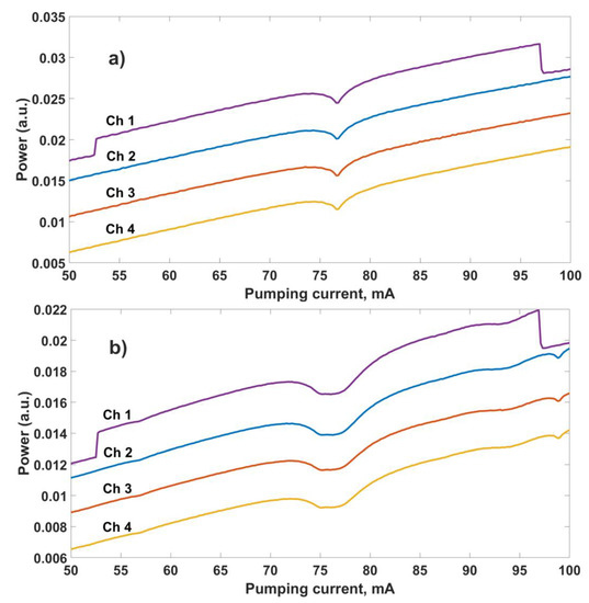 Raw data of the ground-based prototype of a multichannel laser heterodyne spectroradiometer (MLHS) in arbitrary power units. Ch 1–Ch 4 denote IF receiver numbers. (a) Raw data with the atmospheric CO2 absorption line at 1605 nm; (b) raw data with the atmospheric CH4 absorption line at 1651 nm.