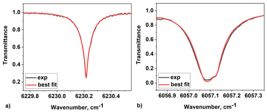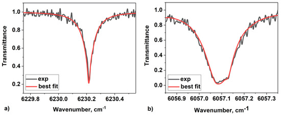 Experimental data of the ground-based MLHS prototype recorded within 2 min period of integration. Black curves are experimentally measured atmospheric spectra; red curves are synthetic ones. Spectra were measured at different times, i.e., not simultaneously. (a) An isolated absorption line of the CO2 band at 1605 nm (6230 cm−1), column CO2 concentration is 406 ± 3 ppm. (b) A quartet of isolated CH4 lines at 1651 nm (6057 cm−1), column CH4 concentration is 1.838 ± 0.008 ppm. The error budget is estimated by a repeated retrieval procedure based on disturbed synthetic data. An oscillating component of measured spectra, which may be noticed in the signal, results from a parasitic interference in the fiber optical system that becomes noticeable due to a high SNR.
