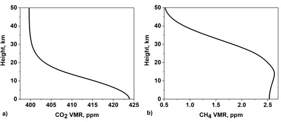 Vertical distributions of (a) CO2 and (b) CH4 retrieved from measured atmospheric spectra, which are shown in Figure 5a,b, respectively. The vertical resolution of the retrievals is about half of the scale height.