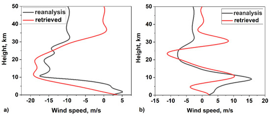 Vertical profiles of the wind speed projection on the line of sight (red curves) (a,b) retrieved from measured atmospheric spectra, which are demonstrated in Figure 5a,b, respectively. Black curves are the reanalysis data. The retrievals’ precision is about 3–5 m/s with a vertical resolution of half of the height scale. (For interpretation of the references to color in this figure, the reader is referred to the web version of this article).
