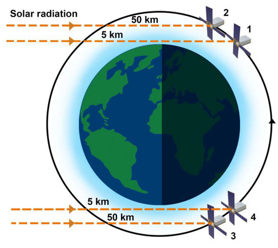 A 2U spaceborne MLHS payload is designed to operate in the solar occultation mode schematically illustrated in Figure 9. According to the observation geometry, there are two measurement windows per orbit, namely the egress (sunrise) window marked in Figure 9 by points 1 and 2, and the ingress (sunset) window marked by points 3 and 4. Atmospheric measurements are carried out at the Earth’s surface point corresponding to a terminator (edge of shaded area).