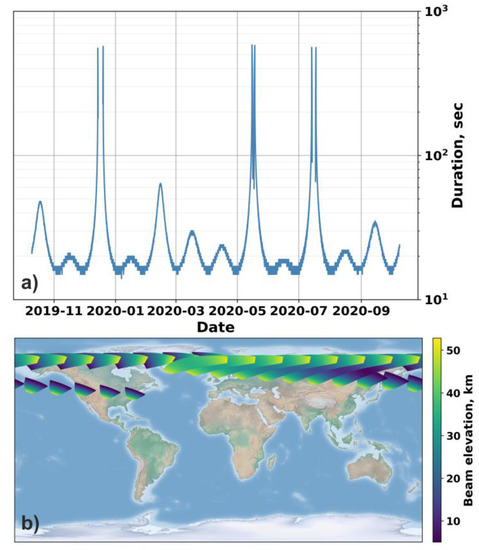 As mentioned in Section 2, the MLHS is considered to be placed on the International Space Station (ISS) orbit, precise orbital parameters of which within last year have been published in the two-line element set (TLE) format [52]. We analyzed the observing capabilities of this orbit in the solar occultation mode in terms of MLHS science objectives, using SkyField framework [53], TLE dataset, Pandas [54], and NumPy [55] Python libraries. The calculations were based on the archive of multiple TLE sets for the mentioned period. Atmospheric refraction was not taken into account. It was evaluated that from 10 October 2019 to 8 October 2020, the spaceborne MLHS could observe the Sun 10,927 times. The duration of Sun observation within the range of tangent heights of 5–50 km in one year period is presented in Figure 10a, where a single flyby has the following duration statistics: the median duration is 19 s, averaged value is 25.8 s, minimal one is 14 s, and maximal one is 584 s. Such a long duration of Sun observation per one flyby results from a relative position of the terminator and the MLHS orbital plane. In this case, the trajectory of the probe is parallel to the terminator. Such configuration is met several times per year. Figure 10b shows the Earth’s surface coverage by MLHS measurements within 24 h. This period corresponds to the date 15–16 May 2020 and meets one of the three rare cases with the maximal duration of Sun observation time within the range of 5–50 km. Although the sunlight passes through atmosphere layers with different tangent heights at the solar occultation geometry, for simplicity, the color bar of Figure 10b indicates the minimal tangent height of the current measurements.