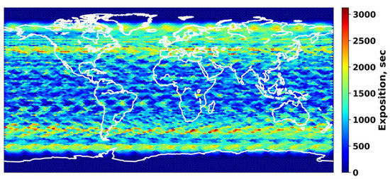 Figure 11 visualizes a map of coverage of the Earth’s surface by MLHS measurements within one year. The color bar corresponds to Sun observations’ exposure time within the tangent height range of 5–50 km. According to the map presented in Figure 11, the Earth’s surface in the latitude range from 30° to 75° in both hemispheres has denser measurement coverage providing the exposure time range from 2000 to 3000 s. Measurement coverage in the latitude range ± 30° has sparser coverage with the exposure time up to 2000 s. Due to the orbit configuration, polar areas above 75° in both hemispheres remain uncovered. Orbital precession effects in our case are helpful for passive coverage of Earth’s atmosphere, even a month of observation provides valuable data for most of the area of interest.