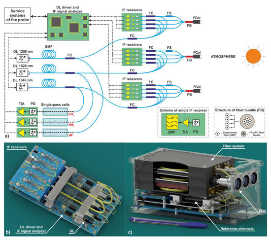 The structure of the spaceborne MLHS is similar to that of its ground-based prototype. Figure 12a shows the sketch of the MLHS, which has three spectral channels, with each channel, in turn, having a multichannel design (four IF receivers per one spectral channel), so that the instrument is equipped with 12 IF receivers. DFB DLs with the fiber outputs are used as local oscillators (LO). Solar radiation passed through the atmosphere is injected into the single-mode optical fiber system (SMF) via fiber collimator (FCol) and then coupled with the DL radiation on the photodiode (PD) of each IF receiver. For each spectral channel, one FCol is used. Solar radiation for each IF receiver is delivered by fiber bundle (FB); its structure is presented in Figure 12a as well. Exploiting FB allows decreasing the weight of MLHS and, in contrast with the fiber couplers (FC), FB does not decrease solar radiation power for each IF receiver. A fiber switch (FS) is installed into the SMF system after the fiber collimator of the first IF receiver for each spectral channel. The purpose of a switch is a dark signal level evaluation based on the technique described in [45]. The IF signal detection and post-processing methods employed in the MLHS are the same as in the ground-based prototype described in Section 3. Management of three DLs is implemented using the FPGA-based DL driver. However, the implementation details of reference channels in MLHS and its ground-based prototype are different. The prototype’s reference cell is filled with a mixture of the same gases to be measured in the atmosphere. In turn, the spaceborne MLHS employs reference cells filled with different gases having strong absorption lines in the spectral range of interest. Replacement of weakly absorbing GHG in the cell by gases having stronger absorption lines in the same spectral range allows us to use compact single-pass optical cells for DLs frequency stabilization. Figure 12b,c presents the model of spaceborne MLHS placed into 2U CubeSat form-factor, assembled from typical telecommunication components. For scale purposes, the pen is placed near the model in Figure 12c.