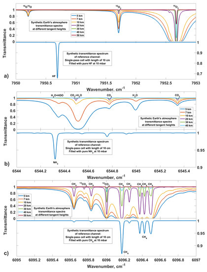 Several critical requirements are affecting the selection of spectral ranges for GHG remote sensing. Firstly, it is desirable to cover as many atmospheric gases as possible in the relatively narrow spectral range of 1200–1650 nm. This constraint is dictated by the availability of a compact and affordable telecommunication component base. Secondly, the broadest range in sounded tangent height should be covered, with observed spectral lines strong enough to be measurable and weak enough to be unsaturated. Finally, it is essential to find gases for reference cells characterized by strong absorption lines in the spectral range of interest. This requirement is dictated by the need for a compact suite of reference channels for DL precise frequency stabilization.