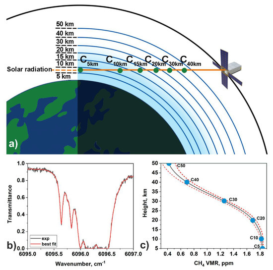 (a) Illustration of cross-influence of atmospheric layers located at different altitudes and different positions over the globe on the resulting measurement in the solar occultation mode. This a geometry of measurements to the building up a tomographic picture of sounded gas distribution. Green dots C5 km–C40 km correspond to blue dots C5–C40 on the profile of (c). (b) Synthetic atmospheric transmittance spectra (black curve) at 1640 nm with SNR of 50 at the tangent height of 5 km. The red curve is the model best-fit spectra used for inverse problem solution and lateral atmosphere structure analysis along the line of sight. (c) Distribution profile of CH4 concentration retrieved along the line of sight (black curve). Red curves are error identification. Blue points C5–C50 in (c) corresponds to the green points C5 km–C50 km illustrated in (a). Do not confuse the CH4 profile illustrated in (c) with the standard vertical GHG profiles, which could be measured during sunrises/sunsets at solar occultation geometry.