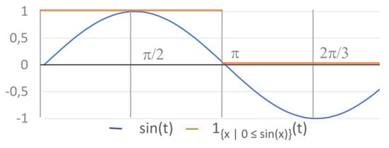 We start with a simple example of system with states modeled by the function and lasting for the time interval (see Figure 1). This function is first positive on subinterval and then it is negative on subinterval . The fact that the function is first positive may be characterized in DC using the Boolean-valued function , which returns 1 if and 0 otherwise. In the first case, the value is 1, and in the second case, it equals 0; we identify with 1 and with 0. is called the characteristic function of the set . To describe that the value of is negative, we can use the characteristic function . This function may be obtained from the first one using logical negation , which swaps 1 and 0. It should be noted that DC does not allow direct access to and its integral, but only via Boolean-valued functions characterizing its values.