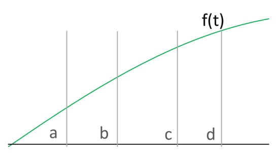This formula, though it may seem complicated, is rather simple. It states that for a given interval and for all its adjacent subintervals, the normalized value of the integral for the left subinterval is lower than or equal to the normalized value of the integral for the right subinterval. It is illustrated in Figure 2. Intervals and are adjacent. The values of the integrals for these intervals have to be normalized by their length, as their lengths are different. We will abbreviate this property of function f as . Analogously, we can define the property of monotonic decrease, . We use a capital letter to indicate that both functions have a functional argument instead of a time value.