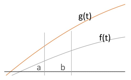 We start with the case when a function is an upper approximation of a function or, equivalently, function is a lower approximation of function (see Figure 3). This property can be expressed by demanding that for each subinterval of a given interval, the integral of f is smaller than or equal to the integral of g: