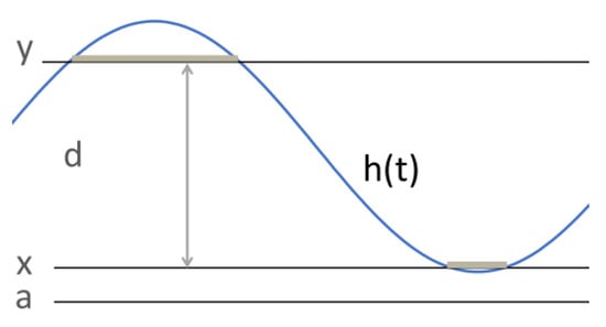 In Figure 4, the intervals correspond to the parts of diagrams of h located below the x and above the y line, respectively, are indicated by bold lines. Below, we abbreviate formula (8) by . Formula is a shorthand of Formula (6) and expresses the fact that function h is above threshold y for some time period.