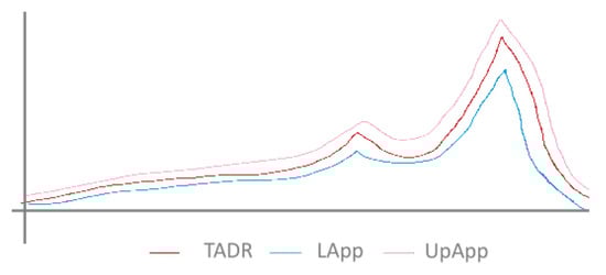We can also require that the peak values be above a certain threshold and the amplitude be above the value of d. These requirements can be formulated as and , respectively. The first formula states that function g reaches a value above threshold , and the second one states that its amplitude is at least equal to d (see Section 4.3). In Figure 7, the first peak is above 400 and the amplitude is above 100; of course, these parameters can be adjusted arbitrarily. The fact of reaching such a peak with the constraints concerning values of threshold and amplitude can be expressed by the formula . This formula is the logical conjunction of the previous formulas; we abbreviate it as . We use capital letters to indicate that functions have functional arguments, not only arguments of type .