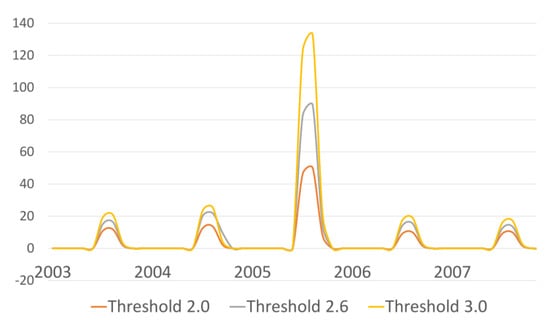 Figure 6 shows an excerpt of Figure 6 from [1]. It contains results obtained by the MODVOLC algorithm detecting thermal anomalies for different thresholds 2.0, 2.6, and 3.0, respectively, in case of the Anatahan volcano monitoring data. The following formula presents the Local Index of Change of the Environment representing the degree to which each pixel deviates from its normal behavior normalized by its variability (cf. [1,29]).