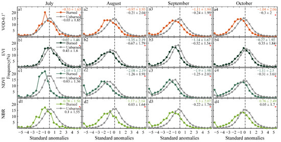 Some differences were found among the anomalies of the burned pixel distribution in the VOD, the EVI, the NDVI, and the NBR regarding the percentage of anomalies for different magnitudes (Figure 5). Optical indices showed a higher median of negative anomalies and a higher percentage of negative anomalies in burned pixels over July–September than the VOD, except for the EVI in July (Figure 5). The percentage difference of negative anomalies (< ‒1 SD) between October and September was greater in optical indices. The declined percentage of negative anomalies in October relative to September was 24%, 23%, and 14% in the EVI, the NDVI and the NBR, respectively, whereas it was 0% and 1.55% in VOD-0.25 (Figure S4c1–c4) and VOD-0.1 respectively. The anomalies’ distribution in the burned pixels of the VOD products at low and high resolutions also showed some differences. There were 42.5%, 49.5%, and 49.5% of burned pixels with negative VOD-0.25° anomalies of more than one standard deviation over August–October (Figure S4(c2–c4)), versus 49.2%, 52.5%, and 50.9% of burned pixels with negative VOD-0.1° anomalies (Figure 5a2–a4). The negative VOD-0.25° anomalies’ distribution changed from September to October (Figure S4c3–c4). The 5.4% of burned pixels with negative VOD-0.25° anomalies greater than two standard deviations (< ‒2 SD) in September decreased in October, and the increasing percentage of negative anomalies between ‒2 SD and ‒1 SD led to a similar percentage of negative anomalies (< ‒1 SD) and median values in September and October. However, there were only 3.67% of burned pixels with negative VOD-0.1° anomalies (< ‒2 SD) decreased in October compared with September.