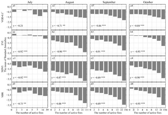 The mean of standard anomalies of (a1–a4) VOD-0.1°; (b1–b4) EVI; (c1–c4) NDVI; and (d1–d4) NBR at different fire event levels from July to October. The significant Pearson correlation coefficient (p < 0.1, p < 0.05, and p < 0.01) was indicated with *, **, and ***, respectively.