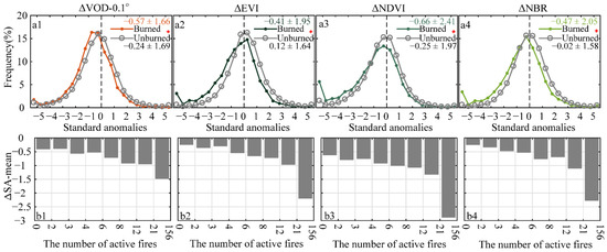 The comparison of ΔVM (ΔVM = VMOct ‒ VMJul) standardized anomalies’ distribution between burned and unburned areas. Histograms of standardized anomalies in (a1) ΔVOD-0.1°; (a2) ΔEVI; (a3) ΔNDVI; and (a4) ΔNBR. A red asterisk indicated that the anomalies between burned and unburned pixels were significantly different. The mean of standard anomalies of (b1) ΔVOD-0.21°; (b2) ΔEVI; (b3) ΔNDVI; and (b4) ΔNBR at different fire event levels.
