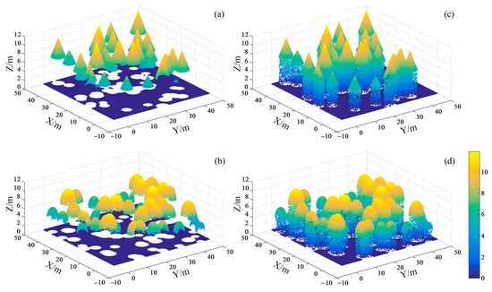 where x , y and z are the spatial coordinates of geometric surface points, r is the radius of the cone and hemisphere and l is the height of a cone. The r and l values are set to 1.5–3.5 and 2–6 m, respectively, and a basic height of 2–6 m is added to the simulated geometry. The average height of the cone is 8.6 m, while that of the hemisphere is 8.8 m. If the simulated geometry overlaps horizontally, the highest point in the vertical direction of the overlapped part is retained to ensure that the sunlit part is the crown surface. In addition, ground points with the same density are added to the non-projection area of the simulated geometry, and the z-value of these ground points is set to 0. Thus, two simulated surface points are created (see Figure 1a,b). Moreover, the surface points were interpolated to the reference CHM (CHMReference) for subsequent comparison. Then, different proportions (10–60%) of noise points are randomly added below the simulated surface to create pits with different sizes. The final simulated point clouds are shown in Figure 1c,d. It is worth noting that the simulated points do not follow the laser scanning sensor geometry, so the distributions of these under-canopy points will not be distributed as the simulated along vertical strata in real data.