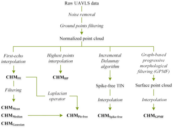 The most widely used, recently developed and representative eight pit-filling methods are selected to generate CHMs, including the first-echo (FE) interpolation method, smooth filtering (mean, medium and Gaussian) method, highest point (HP) interpolation method [12], pit-free algorithm [10], spike-free algorithm [17] and GPMF algorithm [27]. The smooth filtering method and pit-free algorithm are post-processing methods, while the other four methods are pre-processing methods. Figure 3 shows the process of generating CHMs by these eight methods. FE interpolation is a common CHM generation method that is generated by interpolating all the first echoes in the normalized point cloud. Then, the mean filter, median filter and Gaussian filter are used to smooth the FE CHM. HP interpolation first generates 0.1 m grid cells and then extracts the highest point of each cell for interpolation. The pit-free method, spike-free method and GPMF method are described below.