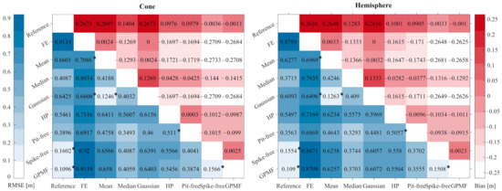 Figure 5. Differences across all the CHMs generated by the simulated point cloud. The lower left corner of the matrix is the RMSE, and the upper right corner of the matrix is the Bias. The asterisk indicates that the t-test was not significantly different.
