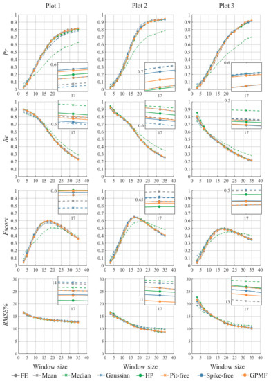 Further analysis showed that the sensitivity of different CHMs to the LM of different WSs was slightly different. In terms of the accuracy of ITD, the median method was the main outlier in the eight methods. Basically, the median filtering CHM performed best in controlling omission errors, but mass commission errors led to the lowest Pr and Fscore values. In addition, almost all methods achieved the highest overall accuracy (Fscore) when WS was 17 × 17 (1.7 m × 1.7 m). Therefore, the small window in Figure 8 is partially enlarged when WS is equal to 17. The dotted line and the solid line represent four post-processing methods and four pre-processing methods, respectively. As there is little difference between these methods, we evaluated them by 50% of the rankings. Specifically, for broadleaf forest, the HP, GPMF and spike-free methods were in the top 50% due to their excellent performances in controlling the commission error. For coniferous and mixed forests, the mean and Gaussian filter showed remarkable performances. For the spike-free method, even if there is an enormous omission error, the extremely high commission error control gives it a high overall accuracy in each stand type. In addition, we found that the post-processing method (mean, median, Gaussian and pit-free method) had a small omission error (Re is usually high), which may benefit from excessive detection.