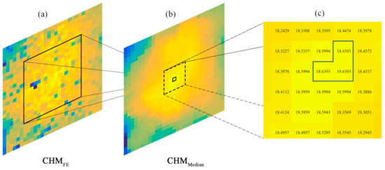 Researchers have proposed a variety of methods to improve the quality of CHMs. These methods can be divided into two categories: raster-based (post-processing) and point cloud-based (pre-processing). The raster-based method generates the CHM first and then eliminates pits by image filtering algorithms. There are many commonly used global filters that can be used to smooth CHMs, such as mean, median and Gaussian filters [14,21,22,23]. These filters are simple and fast, but the heights of all pixels in the CHM (including normal pixels) are altered, and the size of the kernel lacks sensitivity [7,9]. Ben-Arie et al. [10] used a Laplacian operator to detect data pits and used a median filter (kernel 3 × 3) to replace the pit values in the original CHM. Zhao et al. [24] combined the Laplacian operator and the morphological closing operator to determine and rescue invalid values. Shamsoddini et al. [9] proposed an adaptive mean filter (AMF) to detect and fill pits. Although these local filling algorithms improve the abovementioned problems, the error in the original CHM generation process is not considered [25].