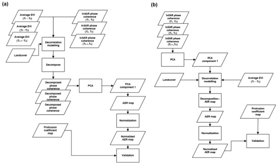 We tested two models and found that it was difficult to establish two variable regression models as listed in Equation (8) and, therefore, employed Equation (9) as a default model instead. Noted that we used long-term (monthly or yearly) average EVIs of time InSAR image acquisition to avoid short-term variation of the vegetation index and void due to cloud coverage. Once the decorrelation component by vegetation was established, we applied it for decomposition either before or after PCA analysis based on time-series phase coherence. Decomposition is a simple division of decorrelation by vegetation from each phase coherence (Figure 2a) or component 1 of PCA analysis based on the phase coherence time-series as shown in Figure 2b. To distinguish the two processes, we named the procedure in Figure 2a as a prior processor and Figure 2b as a posterior processor.
