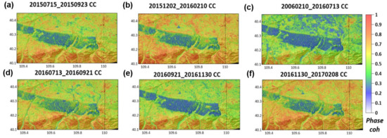 InSAR phase coherence using PALSAR-2, including pairs of (a) 15 July 2015–23 September 2015, (b) 2 December 2015–10 February 2016, (c) 10 February 2016–13 July 2016, (d) 13 July 2016–21 September 2016, (e) 21 September 2016–30 November 2016, and (f) 30 November 2016–8 February 2017.