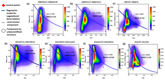 (a,b) The scattergram between the Enhanced Vegetation Index (EVI) and its corresponding single-phase coherence from the PALSAR-1 InSAR pair by a prior processor, (c) The scattergram between the EVI and PCA 1st component from the PALSAR-1 phase coherence time-series by a posterior processor, (d–f) The scattergram between the EVI and its corresponding single-phase coherence from the PALSAR-2 InSAR pair by a prior processor, (g) The scattergram between the EVI and PCA 1st component from the PALSAR-2 phase coherence time-series by a posterior processor. The corresponding regression models were presented as blues lines. Control points indicating high EVI, low phase coherence, and low EVI and high phase coherence were indicated by red points. The color represents the cumulative pixel number of the corresponding EVI-PCA bin. RMSEs were measured over the upper area of the land erosion component and demonstrated with the regression model constant Cm of Equation (1).