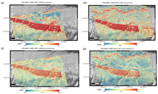 AER maps using ALOS PALSAR-1/2 during 2007–2008 and 2015–2017 periods using a prior processor in (a,b) and a posterior processor in (c,d). Noted that the effects of combating desertification activities are obvious in the posterior processor cases.