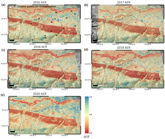 (a–e) Surface erosion map using Sentinel-1 during the 2016–2020 period. Noted that all AER maps were constructed by a posterior processor. The crosshairs in (a) indicate the location of ground control points for normalization. See the next section for the detailed normalization process. AERs of data sets are not controlled by each other’s data ranges. See the next section for the detailed normalization process to assign controlled data ranges using ground control points.