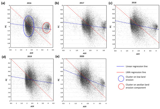 PC vs. InSAR AER in 2016 (a), 2017 (b), 2018 (c), 2019 (d), and 2020 (e). Note that the regression models between the PC and AER were built by an ordinal linear regression model (blue dotted lines) and a least mean squares (LMA) regression model (red dotted lines).