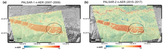 Normalized aeolian erosion (n-AER) maps using ALOS PALSAR-2 pairs of 2007–2009 (a) and 2015–2017 (b). Two n-AER maps now can be assessed against each other as the data ranges of the two maps used the process of employing control points (see Figure 8a). The effects of activities to combat desertification are evident as presented in circled areas.