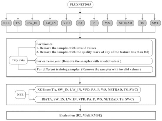 Across the globe, the large amount of EC datasets enables upscaling NEE prediction from site to regional scale, primarily based on process-based models [,,,,] and data-oriented approaches [,]. Process-based ecosystem models can be used for evaluating spatiotemporal patterns and trends of the carbon cycle in terrestrial ecosystems [,,,]. However, there are uncertainties in the description of certain mechanisms, and different parameters have significant impacts on the simulation results []. Additionally, all the models rely on different datasets and intensive computational cost. Data-oriented approaches are the complements to process-based models, and their algorithms and tools are critically important for the robustness of the approaches.