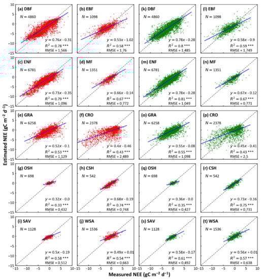 Comparison of predicted and actual values using RF and XGBoost models in each biome. The x-axis represents actual values of NEE by eddy-covariance and y-axis denotes the predicted values by the two models above. The red and green scatters indicate the prediction of RF and XGBoost for each biome, respectively. The dash line represents the equality of predicted and actual values. R2 refers to the determination, RMSE refers to root mean square error, N refers to the number of test data points. * p-value ≤ 0.05, ** p-value ≤ 0.01, and *** p-value ≤ 0.001. (DBF, deciduous broadleaf forest; EBF, evergreen broadleaf forest; ENF, was evergreen needleleaf forest; MF, mixed forest; GRA, grassland; CRO, cropland; OSH, open shrublands; CSH, closed shrublands; SAV, savannas; WSA, woody savannas).