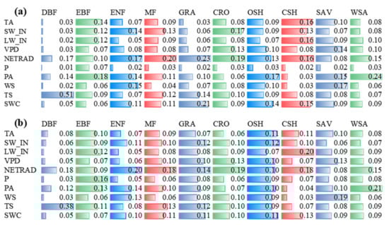 Impurity-based importance of variables in RF (a) and XGBoost (b) models to NEE by biomes (NEE: Net ecosystem exchange; TA: Air temperature; SW_IN: Shortwave radiation, incoming; LW_IN: Longwave radiation, incoming; VPD: Vapor pressure deficit; PA: Atmospheric pressure; P: Precipitation; WS: Wind speed; NETRAD: Net radiation; TS: Soil temperature at the shallowest; SWC: Soil water content at the shallowest).