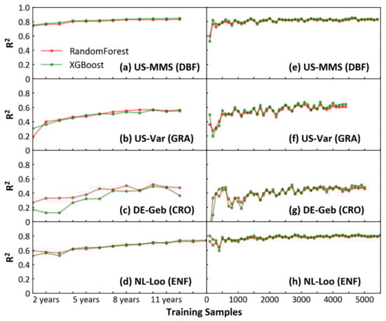 Machine learning models appear to be highly dependent on the training samples. Increasing model training samples benefits model prediction for the same quality of data []. Both RF and XGBoost algorithms are sensitive to the number of training samples (NTS) when simulating the NEE of different biomes at site-level. The prediction results of two models were similar according to BAS (Figure 4a–d) or BFS (Figure 4e–h) method. With the BAS method, the result of XGBoost showed that the R2 of the prediction for the four sites increased with the NTS and reached a stable state when the NTS reached about 8 years of daily samples (Figure 4a–d). With the BFS method, when the assessment curve reached final stability, the R2 assessed by each site (US-MMS, R2 = 0.83; US-Var, R2 = 0.64; DE-Geb, R2 = 0.48; NL-Loo, R2 = 0.79) was generally consistent with the evaluation result of the respective biome to which they belong in Figure 2. In Figure 4e–h, although the prediction of each site eventually reached a steady state with the maximum R2 as the NTS increased, the R2 curves varied among biomes. For the forest biome (Figure 4e,h), R2 reached a steady-state faster with the increase of samples and low fluctuation before the steady state. For GRA and CRO (Figure 4f,g), in contrast to the forest biome, R2 reached a steady-state more slowly and large fluctuation before the steady state.