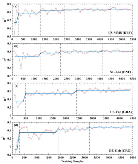 To quantitatively determine the effects of the sample number on the model prediction, the BGSA algorithm was used to test the R2 curves of XGBoost in Figure 4e–h for mutation. In Figure 5, the mutation points ranged from two to four for different sites (US-MMS, DBF, with 4; NL-Loo, ENF, with 3; US-Var, GRA, with 2; and DE-Geb, CRO, with 3). Except for the NL-Loo site, the first mutation position of the other three sites is less than 500. At the left of the first mutation, each curve of R2 fluctuates dramatically and a distinct trough appears. This is likely because when the total sample size is less than 500, then the NTS is less than 350 (approximately one complete observation year), so the NTS is not representative enough. Since both US-MMS (DBF) and NL-Loo (ENF) sites (Figure 5a,b) belong to the forest biome, their mutations are basically the same, at 1300, 2200–2400, and 4100–4500, respectively. The R2 values increase after each mutation. The x-axis in Figure 5 refers to the total number of samples (70% of which are training samples and 30% are test samples), so the NTS corresponding to each mutation is 910, 1540–1680 (the median is about 1600), and 2870–3150 (the median is about 3000). This means for DBF and ENF sites, the training sample number of 910 (approximately 2.5 years daily samples, named YDS hereafter) can stabilize the model, and 3000 (approximately 8.2 YDS) can lead the model to reach the best performance. Compared with the above two sites, US-Var (GRA) and DE-Geb (CRO) sites (Figure 5c,d) reached the stability mutation at delayed positions between 1900 to 2400 (the median is equal to 2150) and the last mutation at an earlier position between 2400 to 3200 (the median is equal to 2800); correspondingly, the NTS are 1505 (approximately 4.1 YDS) and 1960 (approximately 5.4 YDS), respectively. The same trend was observed in the RF analysis for both four sites, detailed in Figure S3.