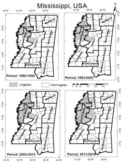 The irrigated and non–irrigated zones in Mississippi, USA from 1980 to 2019. Nine agricultural districts categorized by USDA.