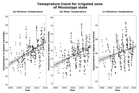 Trends for (a) seasonal minimum temperature, (b) mean temperature, and (c) maximum temperature, trend for non–irrigated zones of the Mississippi State from 1980 to 2019.