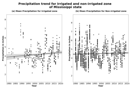 Trends for seasonal precipitation change for (a) irrigated zones and (b) non–irrigated zones of the Mississippi State from 1980 to 2019.